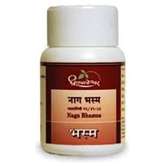 Dhootapapeshwar Naga Bhasma Dhootapapeshwar Naga Bhasma is an ayurvedic medicine, which contains Naga (calcined Lead). It contains nano-particles of lead and the size of the nano-particle is about 60 nm. The compound found in Naga Bhasma is lead sulfide, which is mixed with organic substances and several other minerals that may come from the herbs in which lead is processed before and during its preparation. In Ayurveda, Naga Bhasma is used for the management of frequent urination, urinary incontinence, diabetes mellitus, spleen enlargement, leucorrhoea, hiatus hernia, impotency, rheumatoid arthritis, etc. It is likely to act on the organs such as the stomach, intestine, pancreas, urinary bladder, testes, bones, muscles, joints and ligaments. This medicine should only be taken strictly under medical supervision.