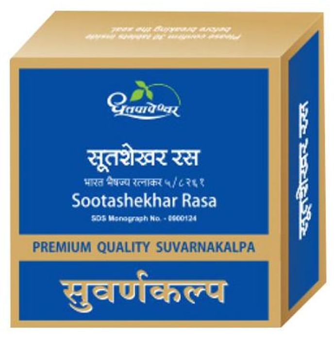 Dhootapapeshwar Sootashekhar Rasa Premium Quality Suvarnakalpa Dhootapapeshwar Soota Shekhar Rasa Premium Quality Gold contains one part of each Shuddha Parad, Dalchini, Shuddha Gandhak, Tamalpatra, Tamra Bhasma, Elaichi, and Suvarna Bhasma as active ingredients that are used to improve functioning of the stomach and helps provide relief from cold and cough. | Key Ingredients: Shuddha Parad Dalchini Shuddha Gandhak Tamalpatra Tamra Bhasma Elaichi Suvarna Bhasma | Key Benefits: It may help in the treatment of cold and cough It can help in alleviating symptoms of cold and cough Can help in providing stomach care | Dosage: Take 1 to 2 tablets once or twice a day, in Kaphaj Vikar with Ardrak Swarasa and honey, Vatavikar with ghee and sugar, Pittaj Vikar with milk and sugar, or as directed by the healthcare professional. | Safety Information: Read the label carefully before use Do not exceed the recommended dosage Keep it away from the reach of children