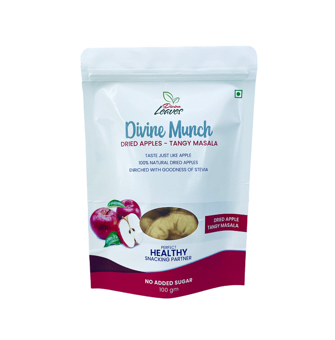 Divine Leaves Divine Munch Dried Apple Tangy Masala Divine Leaves Divine Munch Dried Apple Tangy Masala are full of sweetness and the taste of natural fresh apples with a hint of tangy masala. Divine munch dried apples are the perfect snacking companion that not only tastes great but also provides all of the health benefits of apples.