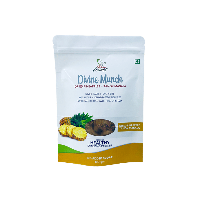 Divine Leaves Divine Munch Dried Pineapple Tangy Masala Divine Leaves Divine Munch Dried Pineapple Tangy Masala is an easy snacking option with the goodness and the taste of pineapple. It is mixed with freshly sliced pineapple, dried and mixed with divine leaves stevia powder, rock salt and species which give it a tangy flavour. It is a sweet-salty combination to fulfil the cravings. It is easier to get these pineapples without waiting for the right season. This also has the health benefit of pineapple that making it a healthy snacking option.