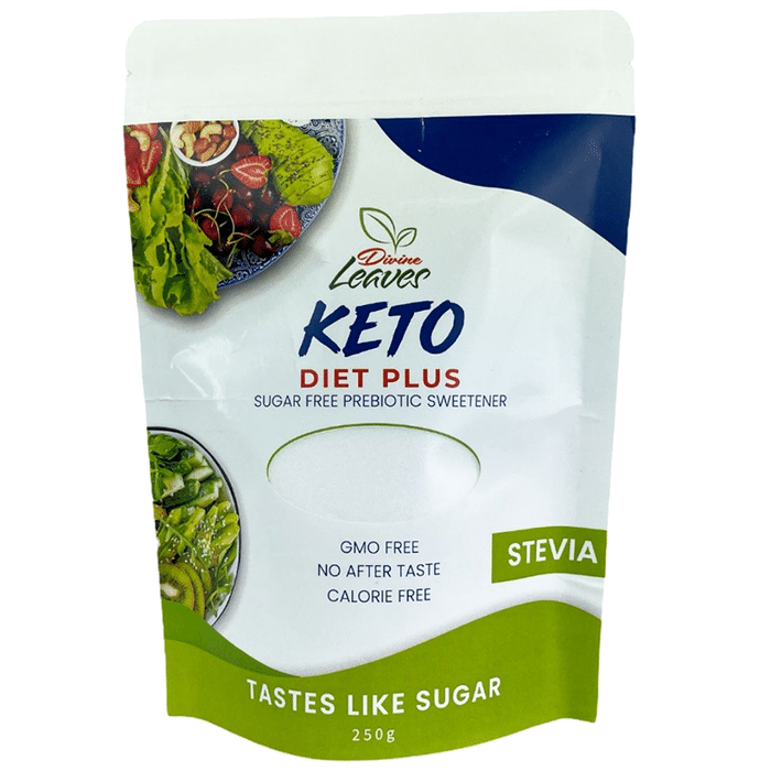 Divine Leaves Keto Diet Plus Sugar Free Prebiotic Sweetener Divine Leaves Keto Diet Plus Sweetener lets you enjoy your favourite shakes, smoothies and desserts without worrying about additional calories. Follow your Keto Diet without carbs but with the zero-calorie natural sweetness of Divine Leaves Keto Diet Plus. This sweetener stimulates your good gut bacteria to grow, which results in better digestion and enhanced immunity. It is 100% natural and contains no added sugar or artificial sweeteners like Aspartame, Sucralose, etc. This product is ideal for diabetes management, weight loss management, calorie control, and maintaining fitness and health.