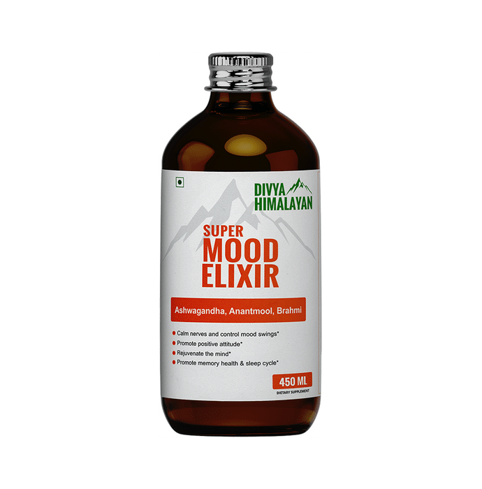 Divya Himalayan Super Mood Elixir It is a dietary supplement formulated with ashwagandha, brahmi, anantmool and other ingredients that help promote a positive attitude and mood. It rejuvenates the mind by calming the nerves and controlling mood swings. It may help reduce stress and anxiety and improve the sleep cycle. | Key Ingredients: Ashwagandha Safed musli Mulethi Haldi Arjuna chhal Anantmool Shatavari Shankhpushpi Brahmi | Key Benefits: It is a dietary supplement that helps promote a positive attitude and mood It may help reduce stress, anxiety, headache and fatigue It rejuvenates the mind by calming the nerves and controlling mood swings It also helps improve memory health and sleep cycle Ashwagandha acts as a revitaliser and helps control anxiety and stress by managing your cortisol hormones Brahmi helps improve memory, focus, and the ability to process visual information It may help reduce stress and anxiety by elevating mood and reducing cortisol levels | Directions For Use: Take 10-20 ml twice a day or as directed by your physician | Safety Information: Read the product label carefully before use Store in a cool and dry place away from direct sunlight Keep out of reach of children Consult a doctor before taking any supplement Do not exceed the recommended dosage Pregnant or nursing mothers, children, and people with medical conditions must consult a physician before taking this supplement Do not use if the product appears to be tampered with or the seal is broken