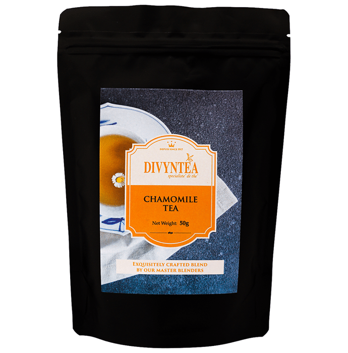 Divyntea Chamomile Tea can make for a soothing cup of tea. This naturally caffeine-free tea is refreshingly sweet yet relaxing. Chamomile herb has been known for centuries for its calming, soothing and digestive properties. As a herbal tea, chamomile has many health benefits and is known to help with restlessness, sleeplessness, anxiety, menstrual cramps, and digestive ailments. | Key Ingredients: Chamomile flowers and buds | Key Benefits: This infusion may help alleviate stomach cramps, may relieve symptoms of insomnia, and may act as an antidepressant This chamomile fusion can also ease headaches Caffeine-free infusions like chamomile are high in antioxidants and can rejuvenate and freshen up without giving the caffeine jitters Chamomile tea is considered a bedtime tea for its sleep-inducing effects Chamomile tea has been valued as a digestive relaxant and has been used to treat various gastrointestinal disturbances | Directions For Use: Wash the teapot with hot water Use about one teaspoon of leaf per person Prepare the water by boiling it and then cooling it till faint steam appears Now pour the water over the tea leaves and let it steep for 3-5 minutes This tea is best enjoyed without milk and sugar | Safety Information: Read the label carefully before use Store in a cool and dry place away from direct sunlight Keep out of reach of children