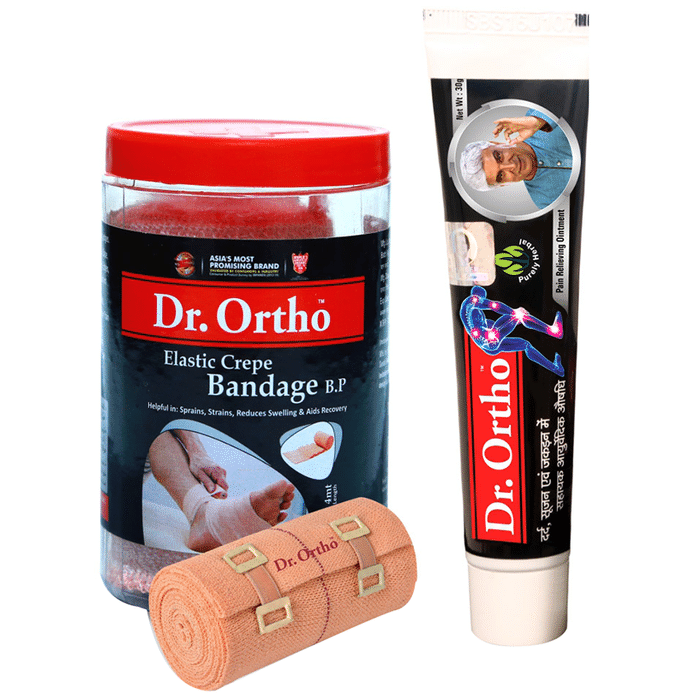 Dr. Ortho Elastic Crepe Bandage (8X4) & Pain Relief Ointment 30gm is made up of 100% cotton and easily washable material. The pain relief ointment provides heat to the muscles, thus reducing the inflammation and pain. | Uses: It is used to provide support for damaged and ruptured muscles. | Salient Features: Bandage made from 100% cotton fabric It is a 100% natural product which does not have any adverse side effects The ointment is made of herbal oils and plant extracts and highly effective in treating muscle and joint pains The crepe bandage is washable, so can be reused for a longer time period | Directions For Use Massage the ointment on the affected part To retain the heat tie the crepe bandage, preferably keep it overnight for effective results | Safety Information: Read the label carefully before use Keep out of the reach of children Should be protected from direct light