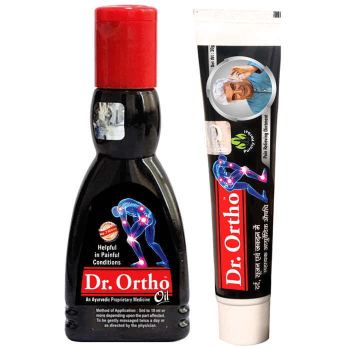 Dr Ortho Combo of Pain Relief Oil 60ml & Pain Relief Ointment 30gm comprises of pain relief oil and ointment that helps to get prolonged relief from backaches, joints pain, knee pain, back pain, shoulder pain and pain from strain, sprains, and bruises. It is highly effective in relieving pain even in hard to reach places like the middle back, neck and lower back pain in people of all ages. Acts as a joint pain relief oil and muscle pain relief oil. | Key Ingredients: Pain Relief Oil Flaxseed oil Cinnamomum camphora oil Mentha piperita oil Pinus roxburghii oil Pain Relief Ointment Nilgiri Oil Turpentine Oil Clove Oil Ajwain Oil Cinnamon Oil | Key Benefits: Pain Relief Oil Flaxseed oil is a good source of healing and anti-inflammatory elements It contains omega 3-fatty acids which can help reduce inflammation in joint Cinnamomum camphora oil has natural painkiller effects and helps stimulate blood circulation across stiff muscles Pain Relief Ointment It has good spreadability which quick absorption over the affected area which ensures relieve from pain even in chronic condition It has the ability of deeper penetration into muscles so ensures quick relief from pain It possesses analgesic and anti-inflammatory properties | Directions For Use: Dr. Ortho Pain Relief Oil Gently massage 5ml to 10ml of oil on the affected area Repeat it twice a day or as directed by the physician Pain Relief Ointment Apply Dr. Ortho Pain Relief Ointment on the affected areas. | Safety Information: Do not exceed the stated recommended daily usage Keep out of reach of children Store in a cool and dry place Keep away from direct sunlight and moisture