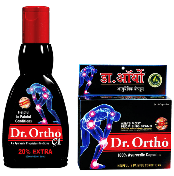 Dr Ortho Combo Pack of Ayurvedic Oil 120ml & Ayurvedic 30 Capsules Dr Ortho Combo Pack of Ayurvedic Oil 120ml & Ayurvedic 30 Capsules are the products that contain blend of ayurvedic herbs which contain anti-inflammatory molecules and deliver broad spectrum of benefits in relieving from various pain conditions like joint pain, back pain, muscle pain, knee pain, elbow pain, shoulder pain, knee pain and leg pain. It provides instant pain relief