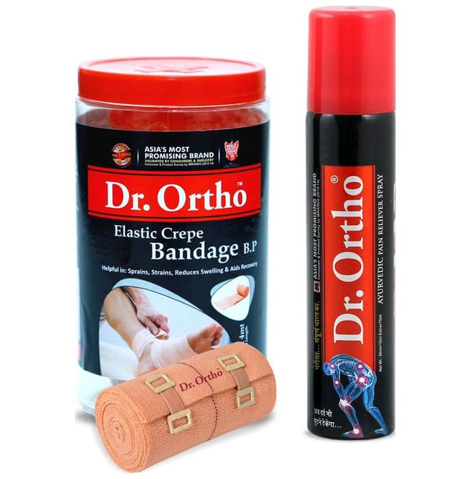 Dr Ortho Combo Pack of Crepe Bandage (10X4) & Pain Relief Spray 75ml Dr Ortho Combo Pack of Crepe Bandage (10X4) & Pain Relief Spray 75ml is a combo pack including crepe bandage and pain relief spray. The crepe bandage treats wounds within a very short duration. It is fully wash proof and has faster healing action which provides complete protection and ease to use. Drab pain relief spray is an ayurveda pain reliever spray which provides prolonged relief from pain.