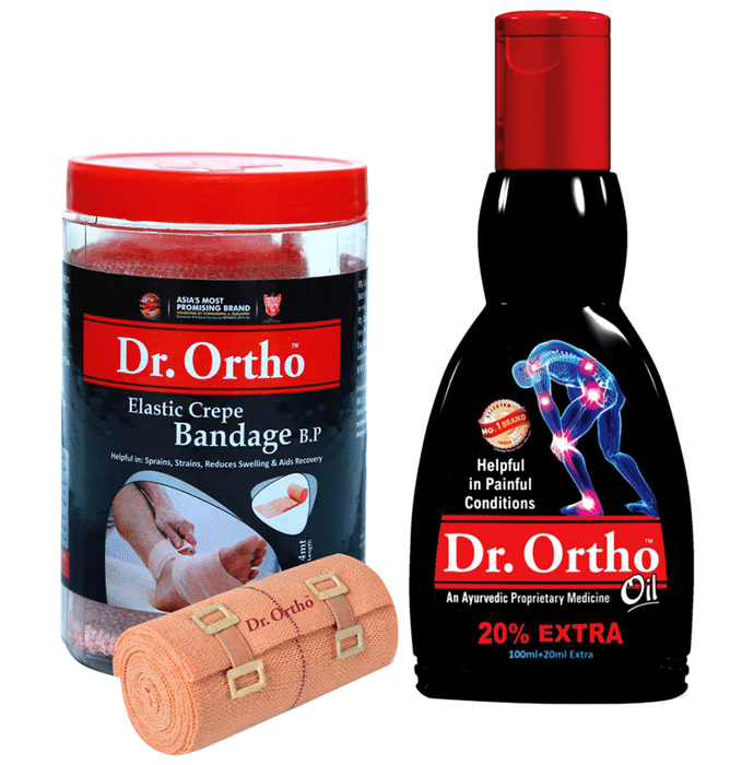 Dr Ortho Combo Pack of Pain Relief Oil 120ml & Crepe Bandage is a combo pack that contains Pain Relief Oil which is a blend of ayurvedic herbs which contain anti-inflammatory molecules and deliver broad spectrum of benefits in relieving from various pain conditions like joint pain, back pain, muscle pain, knee pain, elbow pain, shoulder pain, knee pain and leg pain. | Crepe Bandage is a multipurpose washable compression bandage made out of soft cotton fabric which helps in the recovery of sprains, strains and painful joints. | Key Ingredients: | Dr. Ortho Pain Relief Oil Flaxseed oil Cinnamomum camphora oil Mentha piperita oil Pinus roxburghii oil Gandhapura oil | Uses: | Crepe Bandage It is used to aid in the recovery from painful joints, sprains, strains, dislocations, sports injuries and varicose veins. | Key Benefits: | Dr. Ortho Pain Relief Oil Mentha piperita oil is a blessing to provide a cooling sensation to body and heal joint pain Pinus roxburghii oil provides relief from joint pain because of its saponins and flavonoids elements Gaultheria fragrantissima oil is well-known to treat rheumatism, joint and muscle pain in ayurveda | Product Specifications and Features: Compression Bandage: Which can be used for all Orthopaedic and general use including strains and sprains High Quality Crepe Bandage: Manufactured according to D.I.N/B.I.S Specifications non fraying edges Cotton Fabric: Made of Cotton fabric which is soft on the skin and does not cause any irritation | Directions For Use: | Dr. Ortho Pain Relief Oil Gently massage 5ml to 10ml of oil on the affected area Repeat it twice a day or as directed by physician | Crepe Bandage Wrap Dr Ortho Bandage around the affected area Take caution while wrapping, if fasten tightly then it may obstruct blood circulation When the bandage is wrapped around completely, use pin at the end to hold Washing instructions: Wash in luke warm water, dry on flat surface, squeeze gently, do not stretch, do not Iron | Safety Information: Read the label carefully before use Store in a cool dry place away from direct sunlight Keep out of reach of the children Do not exceed the recommended dosage