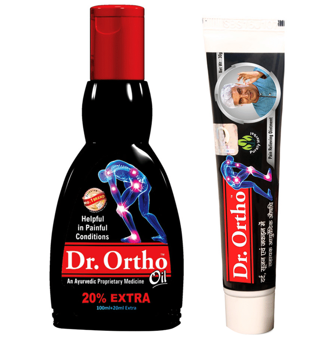 Dr. Ortho Combo Pack of Pain Relief Oil 120ml and Pain Relief Ointment 30gm is an Ayurvedic formulation blended with oil from 8 efficacious medicinal plants. These therapeutic properties of medicinal herbal oils help in relieving pain associated with muscles and joint pains of neck, shoulder, legs, and back. Its effectiveness is based on its quick absorption and penetration. It is the natural way to diminish pain and uneasiness with sustained effects. | Key Ingredients: Linoleic acid Menthol | Key Benefits: These Ayurvedic herbs have proved its efficacy in pain management It helps to improve the condition of painful joints by directly focusing on the painful joint areas Assists to trear pains such as knee pain, low back pain, shoulder pain, and other joints pains effectively | Directions For Use: Use Dr. Ortho Combo Pack of Pain Relief Oil 120ml and Pain Relief Ointment 30gm as directed by the physician. | Safety Information: Read the label carefully before use Do not exceed the recommended dose Keep out of the reach of children Store in cool and dry place Should be protected from direct light