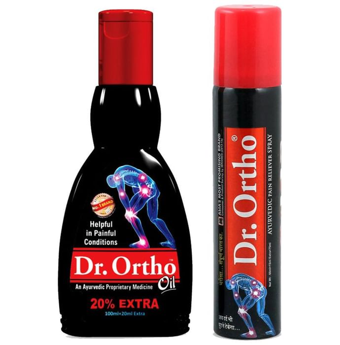 Dr Ortho Combo Pack of Pain Relief Oil 120ml & Spray 75ml Dr Ortho Combo Pack of Pain Relief Oil 120ml & Spray 75ml is an ayurvedic formulation blended with oil from 8 efficacious medicinal plants. These therapeutic properties of medicinal herbal oils helps in relieving pain associated with muscles and joint pains of neck, shoulder, legs and back. Its effectiveness is based on its quick absorption and penetration. t is the natural way to diminish pain and uneasiness with sustained effects.