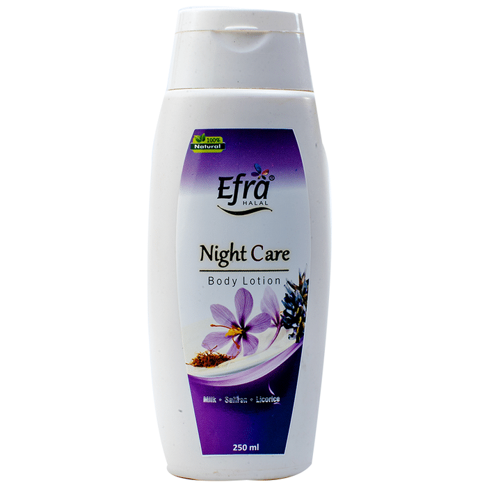 Efra Halal Night Care Body Lotion Efra Halal Body Lotion helps to keep the skin moisturized and nourished. It promotes the skin texture and tone. The ingredients present in the lotion are known to reduce fine lines and fight uneven skin tone. In addition to this, it comes in five different variants namely, Cocoa Radiant, Platinum, Night Care, SPF 30, and Rejuvenate.