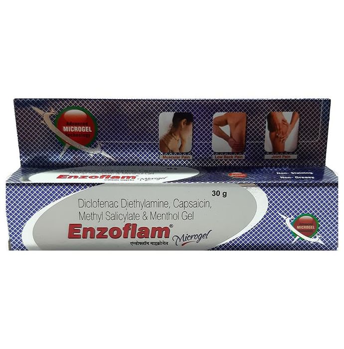 Enzoflam Micro Gel Enzoflam Micro Gel is used to ease muscular pain. It contains Diclofenac, Capsaicin, Menthol, Methyl salicylate. Diclofenac reduces inflammation while Methyl Salicylate and Menthol penetrate deep into the affected area and act as mild analgesics. Enzoflam Micro gel is indicated for relief from pain, swelling and inflammation due to arthritis, low back pain, neck pain & shoulder pain, pain due to sports injury (please don’t apply on open wounds, cuts, burns etc), sprains & strains. Enzoflam Micro can be applied to the site of local pain 3-4 times a day. Since, Enzoflam Micro goes deep to the site of pain in the joints and muscles so it provides quick and effective relief from pain. Benefits of Enzoflam micro gel: Good for sprains, muscle pains Used in case of osteoarthirits Purposeful to athletics Use under medical Supervision