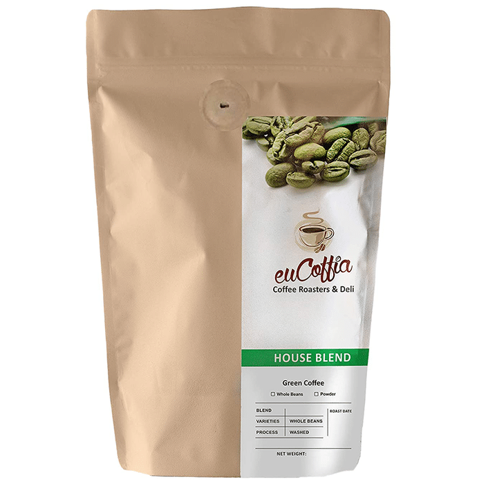 Eucoffia Coffee Roaster & Deli Green Coffee Beans (400gm Each) is a beverage made by infusing frothed milk with a coffee decoction. They are characterized by their light brown colour, lack of oil on the beans and light body (or viscosity). Light roasts are lighter in the body because the coffee bean has not been roasted long enough to produce caramelized sugars or oil. | Key Ingredients: Green coffee | Key Benefits: This product helps to detoxify the blood naturally It promotes healthy skin and fights against skin ageing It contains natural antioxidants which may improve overall health and promote better fat burning It helps in the suppression of appetite and burns excessive fat This green coffee helps to lower the high blood pressure and blood sugar level in the body This formation improves blood circulation and enhances the immune system in the body | Directions For Use: Read the label carefully before use. | Safety Information: Read the label carefully before use Store in a cool and dry place away from direct sunlight Keep out of reach of children