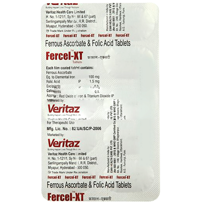 Fercel XT tablet is iron preparation contains Elemental Iron and Folic acid. Role of key ingredients:- Elemental Iron is source of iron,Iron transports oxygen throughout the body and maintains red blood cells, thus making an individual feel energetic and preventing anemia. Folic acid is essential to numerous bodily functions ranging from nucleotide biosynthesis to the remethylation of homocysteine. Both children and adults require folic acid to produce healthy red blood cells and prevent anemia. Fercel XT tablet is used in the treatment of :- Iron deficiency anemia Anemia due to chronic blood loss Weakness and lack of concentration Direction for use:- Fercel XT tablet can be taken orally with water, after meals. Use under medical supervision.