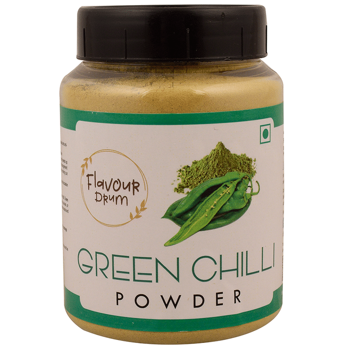 Flavour Drum Green Chilli Powder is a reliable resource of antioxidants. Green chilli powder is obtained by first drying chilli peppers, removing their stems, and then grinding them into rich powders. Adding on to its immense benefits, green chilli powder remains to be impactful in relieving pain and swelling. This spiced green chilli powder is found to help repair damaged tissues and create new blood cells. Flavour Drum's green chilli powder comes in a reusable glass sealed bottle that is 100% organic and free of preservatives. This is an absolute perfect go-to option to make your food a decadent delight and a healthy meal! | Key Ingredients: Green chilli powder | Key Benefits: Green chilli powder has both anti-bacterial and anti-inflammatory properties Rich source of antioxidants and calcium Green chilli helps in burning calories and speeds up metabolism, thus aiding good weight management Eating green chillies regularly help in making our hair shiny and lustrous Capsaicin in green chillies improves blood circulation | Directions For Use: It can be used as a substitute for fresh green chilli Green chilli powder can be added to smoothies, sauces, or baked goods It can also be used to flavour soups and stews | Safety Information: Consumers with food allergies should read the ingredients list carefully Allergen Information: Packed on equipment that also processes other products that contain nuts and cereals Store in a cool and dry place away from direct sunlight