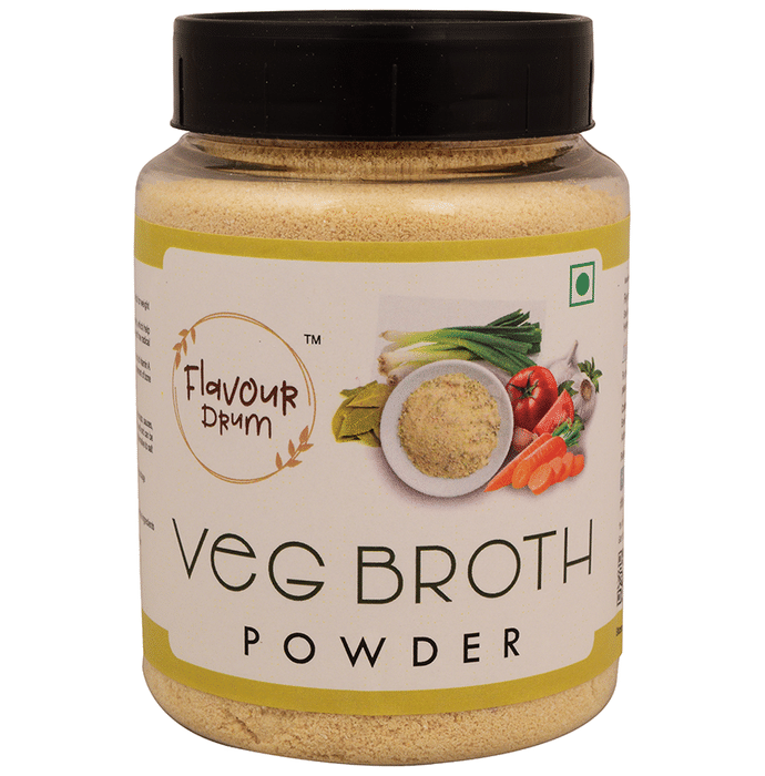 Flavour Drum Veg Broth Powder Don't want to go through the hassle of cutting multiple veggies for your soup, or curry? Flavour Drum's Veg Broth Powder is at your rescue. Get the unique blend of farm-grown vegetables in every spoon of Flavour Drum's Veg Broth Powder. It dissolves instantly in hot water and is perfect for adding flavour to your soups, stews, and sauces. | Key Ingredients: Vegetable broth powder | Key Benefits: Rich source of dietary fibre which is vital for weight management Contains a high number of antioxidants, which help protect the body against inflammation and free radical damage Vegetable broth contains generous amounts of vitamin A Calcium from vegetables boosts bone density Strengthens the immune system | Directions for Use: Add 2-3 teaspoons of broth powder for 1 litre of hot water Boil the stock for a minute, strain and serve | Safety Information: Consumers with food allergies should read the ingredients list carefully Allergen Information: Packed on equipment that also processes other products that contain nuts and cereals Store in a cool and dry place away from direct sunlight
