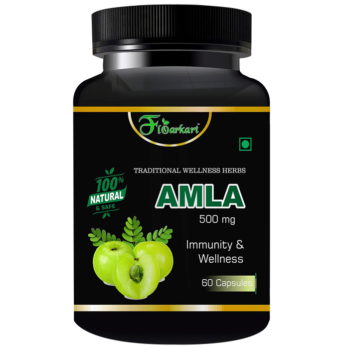 Floarkart Amla Capsule can be used as a supplement for vitamin C. It helps in improving immunity and fights off common cold and cough. Amal is embedded with the richness of vitamin C which is beneficial for the eyes, hair and the digestive system. It contains high fibre content which is excellent for conditions like constipation. | Key Ingredients: Amal extract (Emblica officinalis) 500 mg Vegetarian celluose | Key Benefits: Amla capsules can be used in conditions such as diabetes, asthma and cardiac dysfunctioning These capsules increase insulin response to blood sugar level They also enhance eye health and prevent itching and watering yes Amla is full of anti-inflammatory properties that provide relief in pain and inflammation | Directions For Use: Take 1 capsule with 1 glass of lukewarm water or milk, 30 minutes after a meal or as advised by the physician. | Safety Information: If you are pregnant, nursing or under any other medication, consult your physician before using the product Keep out of reach of children Keep the container tightly closed Store in a cool and dry place away from direct sunlight