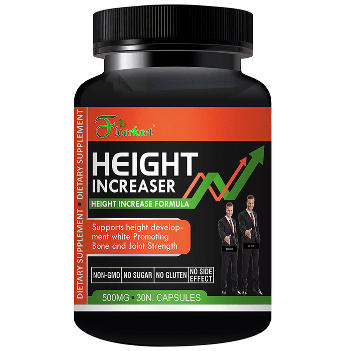 Floarkart Height Increaser 500mg Capsule Floarkart Height Increaser 500mg Capsule aids in the strengthening of bones and joints and helps to increase height. It contains Zingiber officinal, which helps the body's growing performance while also relieving joint discomfort. It contains Withania somnifera, which benefits height enhancement, blood sugar regulation, and stress reduction.
