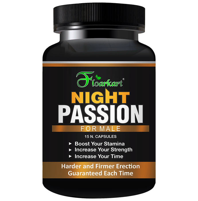 Floarkart Night Passion Capsule for Male can help with male concerns like increasing stamina and improving performance. It contains shilajit, which helps increase testosterone levels and improve sperm count and motility. It also contains swarna bhasma, which has aphrodisiac properties that help boost sperm quality and quantity by increasing stamina and strength. | Key Ingredients: Ashwagandha Kesar Shilajit Swarna bhasma Safed musli | Key Benefits: Floarkart Night Passion Capsule for Male is beneficial for assisting in male issues such as enhancing stamina and improving performance It contains shilajit which aids in increasing the levels of testosterone and helps in improving the sperm count and motility It also has swarna bhasma which has aphrodisiac characteristics that aid in increasing stamina, and strength and improve the quality and quantity of sperm | Directions For Use: Use as directed on the label or as advised by the physician | Safety Information: Read the label carefully before use Do not exceed the recommended dosage Store in a cool and dry place away from direct sunlight Keep out of reach of children