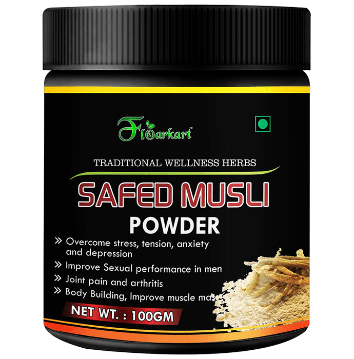 Floarkart Safed Musli Powder Floarkart Safed Musli Powder has been made using white musli, an aphrodisiac and adaptogenic herb. It is a good source of carbohydrates, protein and dietary fibre. It helps maintain healthy body weight and helps to overcome stress and anxiety. It also helps to deal with sexual problems.