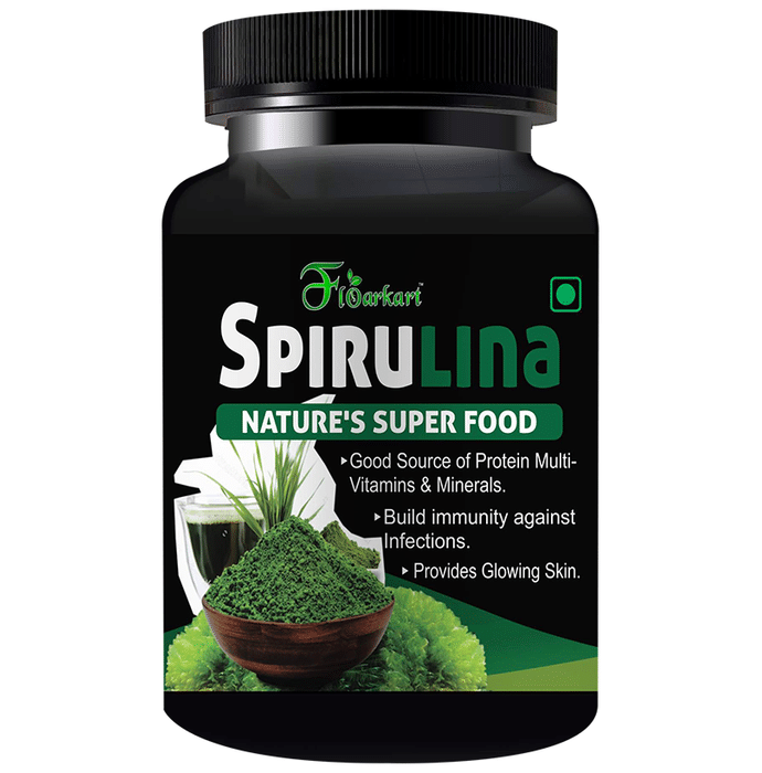 Floarkart Spirulina Capsule is a natural formulation that consists of Spirulina Platensis that is composed of various elements that are beneficial for health. It has vitamins like A, B1, B2, E and K2. The ingredient is a great source of vitamins that can be used as a treatment for the nervous system and metabolism. The capsules are very beneficial as they consist of calcium, potassium, iron and zinc. It can help with weight loss, diabetes, high cholesterol and even help to attain healthy glowing skin. | Key Ingredients: Extract of Spirulina platensis 500 mg Excipients Q.S. | Key Benefits: Contains various vitamins and hence, is a great source of protein, multivitamins and minerals Helpful in lowering high blood pressure, cholesterol and weight loss It has healing properties that reduce allergies and fights liver-related issues It has the antioxidant ability that naturally builds immunity against infections | Directions For Use: Take 1 or 2 capsules two times a day, with lukewarm water or as directed by the physician. | Safety Information: Store in a dry and cool place Keep away from children's reach Do not use if the seal is damaged or missing Read the label carefully before use