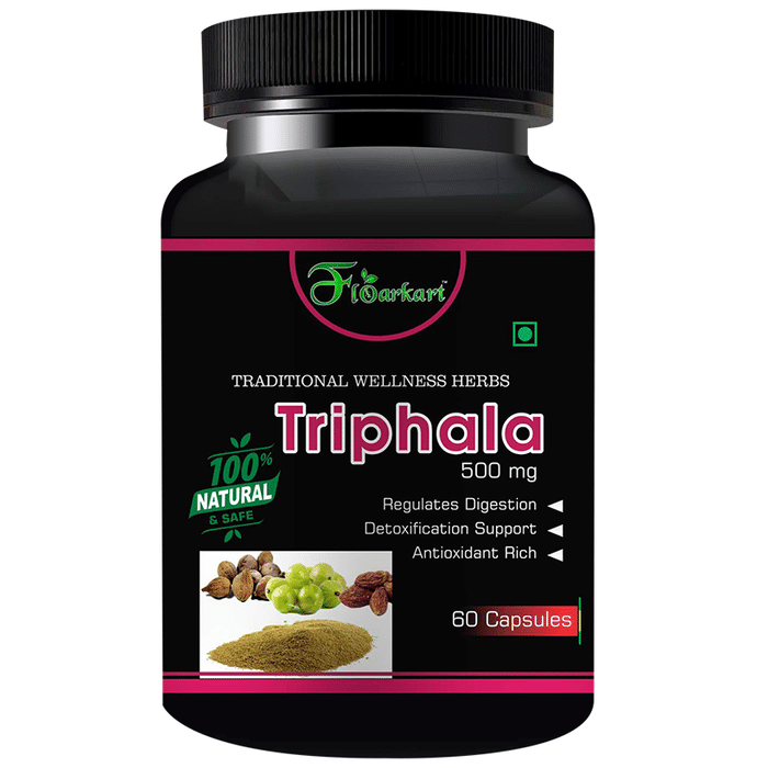 Floarkart Triphala 500mg Capsule Floarkart Triphala 500mg Capsules are purely natural and Ayurvedic capsules made up of Triphala extract which contains powerful anti-inflammatory properties that is useful for controlling diabetes, alleviating inflammation, promoting weight loss, relieving stress, reducing cholesterol and treatment of various bacterial and fungal infections. Being rich in antioxidants, it also helps in building immunity and promotes nutrient absorption. These capsules do not contain any sort of fillers, binders or common allergens and are completely safe to consume.