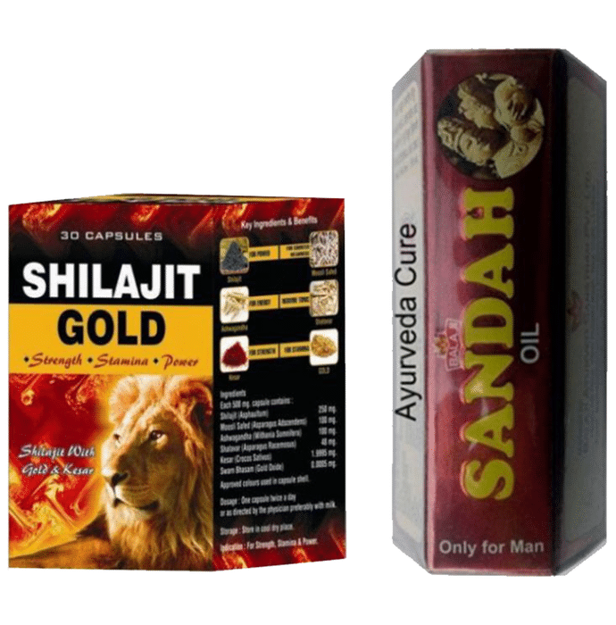 G & G Pharmacy Shilajit Gold 30 Capsule & Sandha Oil is a combination of two products where shilajit is an Ayurvedic preparation which is useful in stress, fatigue, exhaustion, general weakness and loss of libido. It is formulated to reduce the anxiety and stress in the body. Sandha oil is a penis enlargement oil, which is safe and is blended with essential herbs that are suitable for treating and improving the size and erections problem. | Key Ingredients: Shilajit Sandha Oil | Key Benefits: Helps to give you long lasting time during sexual intercourse Improves the sexual desire, hormonal level and is safe and helps to relax mind and body, enhances strength and vitality May help to increase the length of the male genital making in stronger Gives strength to the muscles and acts as a vitaliser Acts as an energizer and helps to boost the immune system | Directions For Use Take 1 capsule twice daily preferably after meals or as directed by the physician. For better results it should be taken with warm water. Apply 7-8 drops on the sandha oil on the genital organ and massage gently twice a day for at least 60 days | Safety Information: Read the label carefully before use Store in a cool dry place away from direct sunlight Keep out of reach of the children Do not exceed the recommended dosage