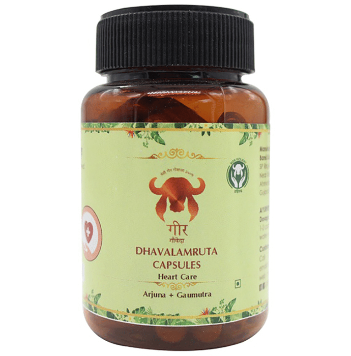 Gir Gauveda Dhavalamruta Capsule is a specially designed formula with the goodness of Arjuna and Gaumutra. As per ancient Ayurveda as well as modern research, Arjuna works as a heart tonic and helps maintain a healthy heart. It may strengthen the heart muscles and rejuvenates them. Arjuna is used extensively in maintaining healthy blood pressure, and normal cardiac functioning and promoting cardio-respiratory endurance. Arjuna helps to improve coronary artery blood flow, reduce chances of clot formation and protect the heart muscles. | Key Ingredients Arjuna | Key Benefits: It is useful in maintaining a healthy heart. It helps to strengthen and protect heart muscles and It contains the goodness of arjuna It may normalise cardiac functioning and gives you healthy blood pressure | Directions For Use: 1-2 capsules per day with warm water or as directed by physician | Safety Information: Store in a cool and dry place away from direct sunlight Read the label carefully Keep out of reach of children
