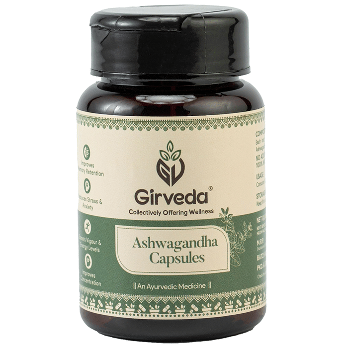 Girveda Ashwagandha Capsule is made from pure Ashwagandha extract, also known as ‘Indian ginseng, which helps in building the immune system of the body, calms the brain and reduces blood pressure. Ashwagandha is used as a traditional adaptogen that helps the body to cope with stress and anxiety. It also maintains the level of cortisol, blood sugar and fat in the body. | Key Ingredients: Ashwagandha extracts | Key Benefits: Ashwagandha capsules are helpful in relieving stress and anxiety It is anti-inflammatory and antioxidant in nature, therefore improves physiological endurance It helps in enhancing memory and uplifts mood These capsules are beneficial in the rejuvenation of the body | Directions For Use: Use as directed on the label. | Safety Information: Read the label carefully before use Store in a cool and dry place away from direct sunlight Keep out of reach of children