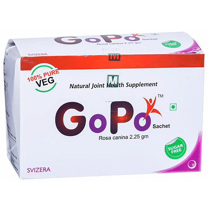 Gopo Sachet Gopo Sachet contains Rose hip extract. Rosehips are the berry fruits of wild briar rose (Rosa canina) and is a natural source of vitamin C. The vitamin C content of fresh rosehips is higher than that found in citrus fruits. Rosehip is also high in folate and contains vitamins A, B3, D and E along with potentially beneficial flavonoids, carotenoids, malic acid, tannins, magnesium, zinc, copper and numerous other phytochemicals (plant chemicals) including recently characterized galactolipids (fats combined with complex sugar molecules). Rose hip powder is anti-inflammatory yet it avoids the ulcer causing side-effects of allopathic pain killers Gopo Sachet is recommended for managing osteoarthritis by reducing pain, damage to joint, reducing joint Inflammation & improving joint flexibility. Use under medical supervision