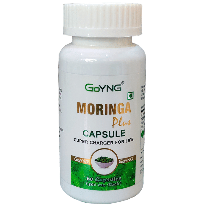 GoYNG Moringa Plus Capsule is a completely natural vegetarian capsule. It is rich in healthy antioxidants and bioactive plant compounds. Moringa is an immunity booster that may help in weight management, is suitable for skin and hair, has anti-ageing properties, and stimulates hair growth. It is loaded with nutrients, vitamins and minerals. It is a certified formulation and is certified by CMIRD, manufactured in a GMP-certified factory, and ISO certified. It is a natural supplement with no side effects. It does not contain sugar and is safe for all. | Key Ingredients: Moringa plant extract | Key Benefits: It contains approx 17 times more calcium than that milk and 25 times more iron than that spinach It is a rich source of vitamin C and amino acids (amino acids from proteins) It can boost overall energy level and increases stamina and vitality The tablets contain approx. 90 nutrients and 46 antioxidants The tablets are nutritionally rich in vitamins, minerals, and amino acids and are a rich source of vitamin A, B1, B2, B3, B6, K, E, and C Moringa has many names like drumstick, moringa oleifera, sahjan, shevga, munaga, murungai, muringa, mashinga etc. Moringa leaf extract may be used as a food preservative It can nourish the hair for healthy growth and help nourish skin | Directions For Use: Take one capsule twice with lukewarm water 30 min before the meal or as directed by healthcare professionals | Safety Information: Read the label carefully before use Store in a cool and dry place, away from sunlight Keep out of reach of children Use under medical supervision Don’t exceed the recommended dosage