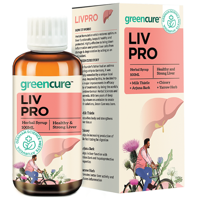 Green Cure Liv Pro Herbal Syrup Green Cure Liv Pro Herbal Syrup provides the goodness of Milk Thistle, Arjuna Bark, Chicory and Yarrow Herb. Milk Thistle strengthens the tissues and detoxifies alcohol-related effects. Chicory is a potent antioxidant that increases the production of bile and facilitates fat digestion. Arjuna Bark is a powerful herb that reduces blood fat and improves liver functionality. Yarrow herb aids in bile secretion and promotes better liver activity and digestion. Besides, the product is GMP certified and free from harmful chemicals and toxins.