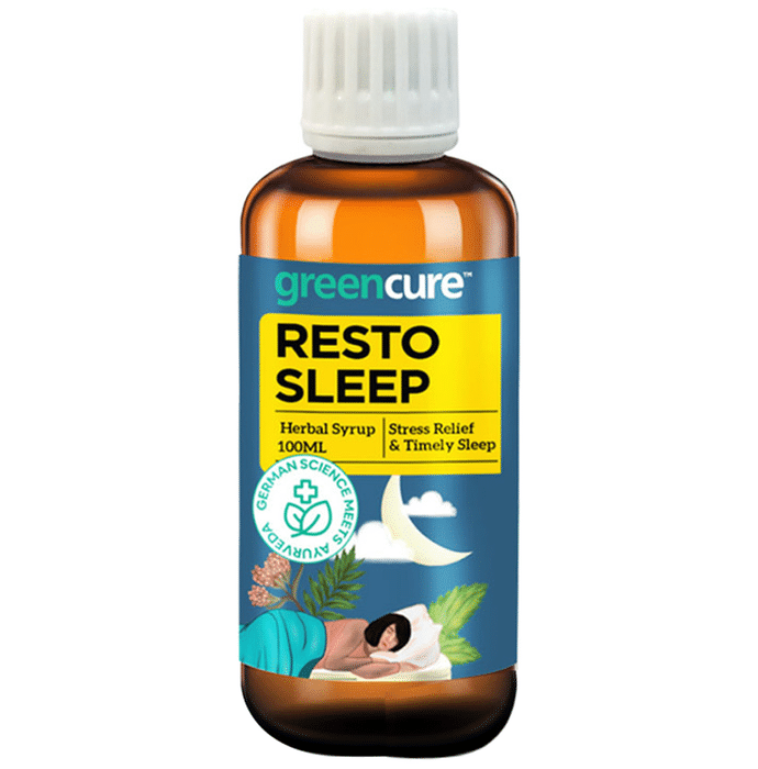 Green Cure Resto Sleep Herbal Syrup Green Cure Resto Sleep Herbal Syrup is a unique 100% herbal formula that helps people achieve faster and provides better sleep with a calm state of mind. A natural solution for stress and anxiety, lack of sleep and undesirable sleeping schedule. Get a fresh, energetic and productive day with Restosleep day in day out. Restosleep by Green Cure is a unique formula designed by German Scientists in collaboration with Ayurveda Experts. It is enriched with Ayurvedic Ingredients- Lemon Balm and Valerian Root that promote your body’s natural sleep process by helping your mind get into a peaceful state and reducing stimulation to aid sleep onset.