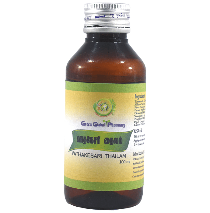 Green Global Pharmacy Vathakesari Thailam Green Global Pharmacy Vathakesari Thailam Vatha kesari thailam/vat kesari oil is herbal siddha medicated oil. This oil or taila is applied topically and massaged to relieve pain in the body's joints, ligaments, muscles, nerves, tendons, and structures that support limbs, neck and back.