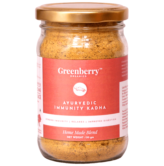 Greenberry Organics Ayurvedic Immunity Kadha Greenberry Organics Ayurvedic Immunity Kadha is a herb drink made to perfection with the blend of the most delicate, rich Indian species which give an immense taste, enhancement and improves body immunity. This blend is made within tiny batches to ensure freshness and richness of the home picked and blended spices in an organic farm setting. It soothes the throat and gives a boost to immunity if taken regularly.