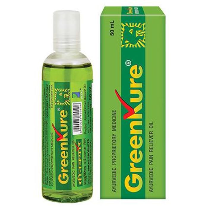 Greenkure Ayurvedic Pain Reliever Oil contains Nilgiri Oil (Eucalyptus Oil), Laung ka tel (Clove Oil), Pudina ka Phool (Mint), Nirgundi ka tel, Oil of Winter Green, and Kapur as major ingredients. GreenKure is an Ayurvedic pain relief oil for quick action and fast relief from body pain. | | Key benefits/uses of Greenkure Ayurvedic Pain Reliever Oil: | - Beneficial in the treatment of problems including a backache, body stiffness, muscular pain, headache, cold, sprain, bruises and more. | - The formulation is non-sticky and has refreshing aroma | - Composed of pure natural ingredients which provide prompt relief | | Direction for use: | - Apply Greenkure Ayurvedic Pain Reliever Oil to the affected area of the body and gently massage if necessary. | - For relief from the stuffy nose during cold, roll Greenkure on a handkerchief and inhale at regular intervals as comfortable. | - Post-exertion such as long journey, trekking and tiresome sports, massage the body with few drops of Greenkure and bath with lukewarm water to experience instantaneous relaxation | Indication: Bone, joint and muscle pain and aches | | Storage instructions: Keep in a cool, dry place away from direct sunlight | Safety information: | - For external use only | - For adult use only | - Avoid contact with eyes | - Do not use on delicate, cut, broken, and sensitive areas of skin | - In case severe irritation persists, consult the physician | - Keep out of reach and sight of children