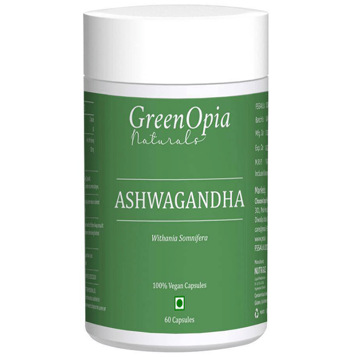 GreenOpia Naturals Ashwagandha Capsule provides the goodness of Ashwagandha, a herb that is extensively used in Ayurveda, the traditional herbal system in India. Ashwagandha is used as a general tonic and adaptogen, providing numerous benefits for your body and brain. It can boost brain function, lower blood sugar and cortisol levels, and help fight symptoms of anxiety and depression. Ashwagandha offers several health benefits to both men and women. | Key Ingredients: Ashwagandha | Key Benefits: Ashwagandha helps in boosting immunity naturally Helps in reducing stress and anxiety May reduce symptoms of depression Ashwagandha aids in reducing inflammation by improving the immune cells that fight infection Ashwagandha promotes antioxidant activity to protect the nerve cells from harmful free radicals Ashwagandha is a natural antioxidant, which improves overall health and promotes better fat burning indirectly | Directions For Use: Take 1 capsule twice daily after meals or as directed by a healthcare practitioner. | Safety Information: Read the label carefully before use Store in a cool and dry place away from direct sunlight Keep out of reach of the children