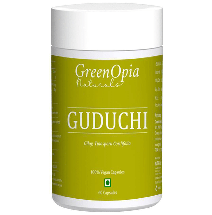 GreenOpia Naturals Guduchi Capsule GreenOpia Naturals Guduchi Capsule provides the goodness of Guduchi, an important herb that has been used in Ayurvedic Medicine for thousands of years. Also called Tinospora cordifolia, Giloy, and the Nectar of Life, 5his herb was considered by ancient practitioners to have immense power and to have the ability to regenerate bodily tissues. The detoxifying effect of Guduchi very well documented in ayurvedic literature is especially good for skin health.