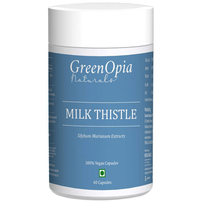 GreenOpia Naturals Milk Thistle Vegan Capsule provides the goodness of Milk Thistle, also known as ‘doodh patra’ in Hindi. It is a flowering herb that provides you with a host of therapeutic properties. Ayurveda vouches for its medicinal values in treating liver disorders, galls stones, shielding the liver from the effects of alcohol, and promoting lactation, besides flushing out toxins. The active ingredient in milk thistle is a group of plant compounds known as silymarin, known for its strong anti-inflammatory, antiviral and antioxidant properties. Milk thistle is beneficial in shielding the liver from the damage caused due to alcoholic liver disease, non-alcoholic fatty liver disease and hepatitis. Milk Thistle supplements are effective in lowering liver inflammation and prevents damage caused due to free radicals. | Key Ingredients: Milk Thistle Extract | Key Benefits: Promotes healthy liver function Promotes healthy heart May control blood circulations Helps in weight loss It is an anti aging agent | Directions For Use: Take one capsule after a meal as directed by a healthcare practitioner. | Safety Information: Read the label carefully before use Store in a cool and dry place away from direct sunlight Keep out of reach of the children