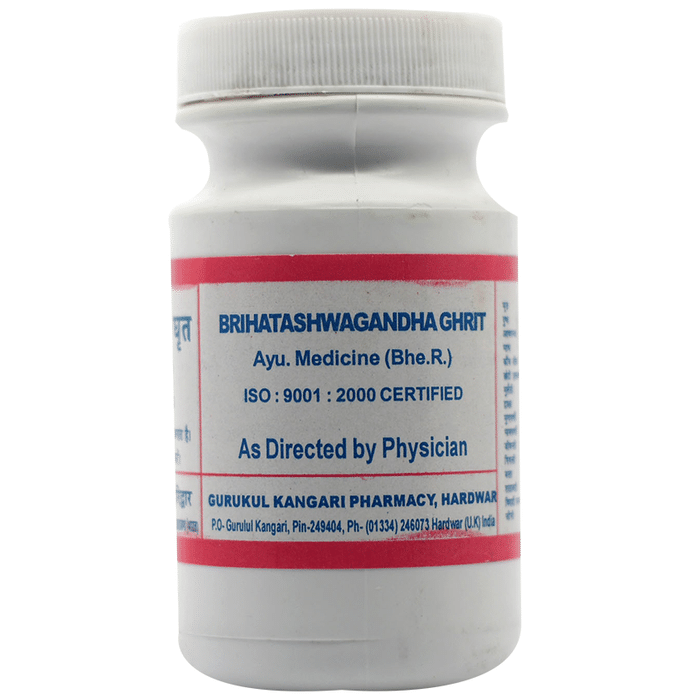 Gurukul Brihatashwagandha Ghrit is an Ayurvedic formulation that comes in ghee form. It is a blend of many herbal ingredients that are used in the treatment of oligospermia, weight loss, male and female infertility. | Key Ingredients: Ghrit Milk Ashwagandha Kaunch beej Pippali Chhoti elaichi Mulethi | Key Benefits: It is used in the aphrodisiac treatment that can get rid of male and female infertility It improves the chances of conception in males and females For people looking to bulk-up, it offers a gain in weight Useful in the treatment of cough, asthma, tuberculosis, chronic and intermittent fever Works as a good herbal anti-ageing remedy | Directions For Use: Use as directed on the label or as advised by your physician. | Safety Information: Read the label carefully before use Keep out of reach of children Store in a cool and dry place away from direct sunlight