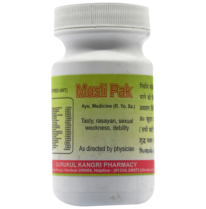 Gurukul Musli Pak Powder is an Ayurvedic formulation of potent herbs and ingredients that is extremely beneficial for men to reduce weakness and impotency. | Key Ingredients: Safed musli Ashwagandha | Key Benefits: Promotes sperm fertility and count Reduces debility and general weakness Enhances sexual performance and stamina Helps treat impotency | Directions For Use: Use as directed on the label or as advised by your physician. | Safety Information: Read the label carefully before use Keep out of reach of children Store in a cool and dry place away from direct sunlight