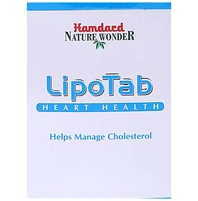 Hamdard Lipotab Tablet contains Badranjboya Extract (Nepeta hindostana), Garlic (Allum sativum), Turmeric (Curcuma longa), Seer, Chobzard, Lactose, Starch, Chalk Powder and Gum Acacia as ingredients. | Key benefits/uses of Hamdard Lipotab Tablet: | - The formulation helps to reduce the levels of bad cholesterol (LDL) and triglycerides | - Promotes general well being by managing the cholesterol levels and also improves associated symptoms | Direction for use/Dosage: | - For adults: Take two tablets once daily in the evening preferably after the meal or as directed by the physician | Indication: | - Cardiac care | Storage instructions: | - Store the formulation in cool and dry place | Safety information: | - Read the label carefully before use | - Do not exceed the recommended dose | - Keep out of the reach of children