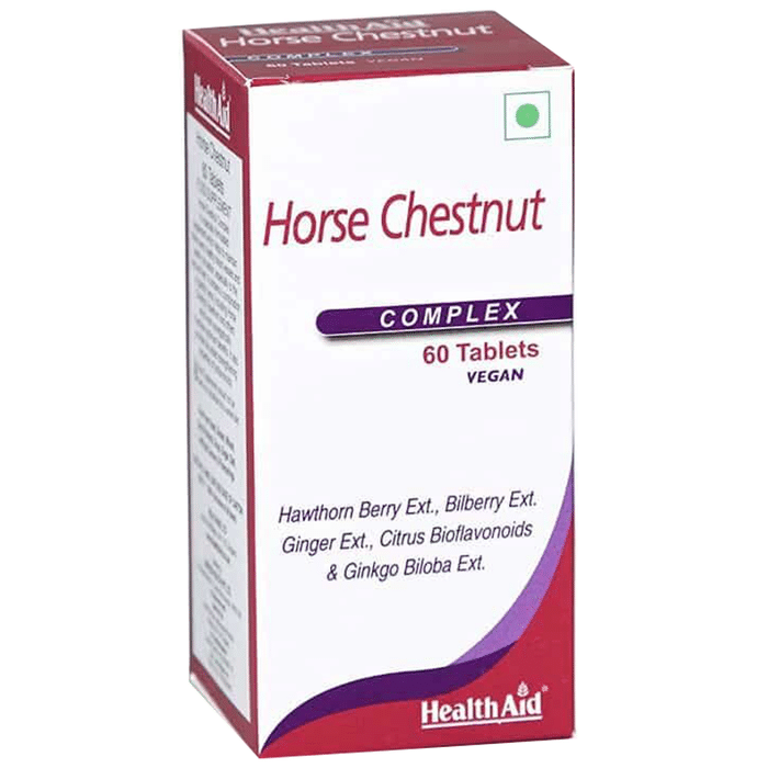 Healthaid Horse Chestnut Butcher's Broom Complex Tablet Healthaid Horse chestnut Butchers Broom Complex Tablets are specifically formulated for the body’s specific requirement. This complete combination contains high potency standardised herbal extracts with Hawthorn, Bilberry, Ginkgo, Ginger, Cayenne plus other herbals that work synergistically to help maintain healthy circulation to the legs and feet.These capsules will be of best use to maintain heart health and achieve a healthy circulatory system. They also help to strengthen and protect blood vessels and work as an anti-inflammatory agent. Regular intake to this medicine also helps to reduce fluid retention by increasing the permeability of the capillaries. They also reduce the occurrence of varicose veins and improve health.These capsules also work as an antioxidant and protect arteries from oxidative damage Key Benefits: Promotes healthy circulatory system Works as an antioxidant Reduces varicose veins Protects blood vessels Maintains heart health Direction of use: Adults one tablets daily; can be increased up to 2 tablets daily if reuqired. Do not exceed recommended daily intake unless advised by a suitably qualified person. Use under medical supervision
