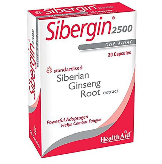 Healthaid Sibergin 2500 Capsule Healthaid Sibergin 2500 capsule contains Siberian ginseng which is a powerful adaptogen than can help promote a feeling of stamina and endurance. It is a potent herb that helps combat fatigue and promote general wellbeing for men and women of all ages. Sibergin contains 500mg of standardised Eleuthero Extract. These capsules are good to stimulate and strengthen the immunity system and protect the body against the adverse effects of stress. Ginseng is truly a life saver as it is consumed by many people nowadays to maintain vitality and energy Key benefits of Healthaid Sibergin 2500 capsule: Helps enhance mental and physical strength Acts as a powerful adaptogen Helps promotoe general well being Increases strength and energy level in men and women The direction for use: One capsule daily upon rising. Wait 20 minutes before eating. Do not exceed recommended daily intake unless advised by a suitably qualified person Use under medical supervision