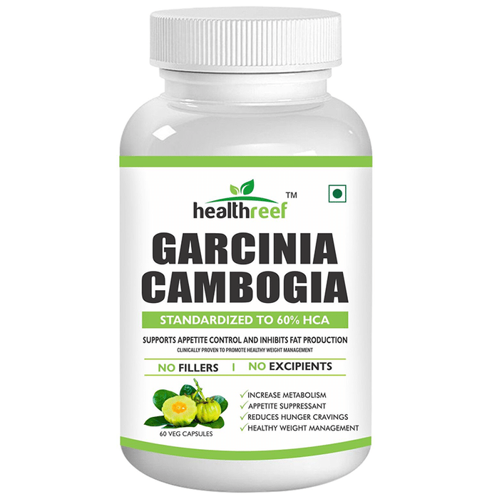 Healthreef Garcinia Cambogia Veg Capsules is a natural way to a healthy body. Garcinia cambogia extract stimulates the body to lose weight organically, and suppress your appetite. This natural acid exists on the skin of the garcinia fruit, and research has shown it can help decrease your body fat, boost your metabolism and act as a natural appetite suppressant | Key Ingredients: 60% Hydroxycitric Acid (HCA) | Key Benefits: It increases metabolism It works as an appetite suppressant It reduces hunger cravings It promotes healthy weight management | Directions For Use: Take 2 capsules with food daily. For optimal use, take one capsule two times daily 20-30 minutes before a meal with a full glass of lukewarm water or as directed by your healthcare professional. | Safety Information: Read the label carefully before use Store in a cool and dry place away from direct sunlight Keep out of reach of the children Do not exceed the recommended dose Do not use if you are pregnant or nursing a baby Individuals with known medical conditions should consult with a physician before using this or any other dietary supplement
