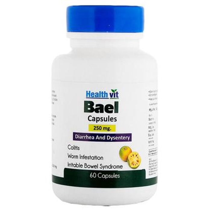 HealthVit Bael 250mg Capsule Healthvit Bael 250mg capsules contain Bilva (Aegle marmelos) fruit extract. Key benefits of Healthvit Bael 250mg capsules: Reduces the frequency of bowel movements and calms intestinal spasms and pain. Helps in controlling diarrhoea-causing microorganisms (E. coli, giardia, rotavirus) and its toxic effects on the intestines. Helps protect and prevent ulceration of the inner mucous lining of the stomach and intestines. Supports intestinal flora and aids healthy digestion. Treat Irritable Bowel Syndrome (IBS) especially diarrhoea. Given as a co-prescription to oral antibiotics. Bael has antiviral, anthelmintic and anti-inflammatory properties which work against intestinal pathogenic organisms. Direction to use: As a dietary supplement for adults, 1 or 2 capsules daily preferably at mealtime or as directed by health practitioner. Safety information: Pregnant, nursing women or individual taking any medications, consult the doctor before use. No artificial color, flavors or preservative added, no chemical solvents. Use under medical supervision.