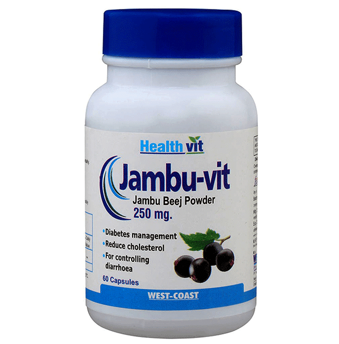 HealthVit Jambu-Vit 250mg Capsule HealthVit Jambuvit 250mg capsules contains Jambu beej powder (Eugenia jambalaya). Due to its astringent property Jamun benefits a lot in frequency of urine. Jamun Beej also strengthen the cardiac muscles. Key benefits of HealthVit Jambuvit 250mg capsules: Promotes Immunity. Act as anti bacterial. Controll diarrhoea. Reduces cholesterol. Reduces sugar level It has digestive and liver stimulant properties. Helps in glucose metabolism. Direction to use: One capsules twice daily, preferably after meals. Safety information: Pregnant, nursing women or individual taking any medications, consult the doctor before use. No artificial colours, flavours or preservatives added, no chemical solvents. Use under medical supervision.