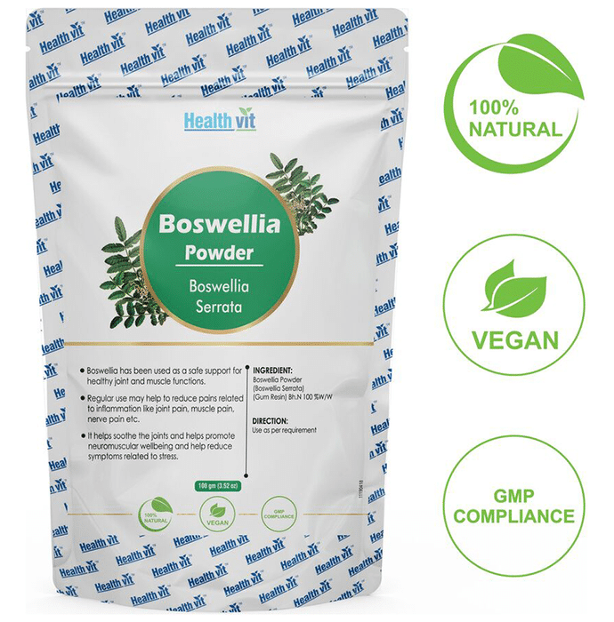 HealthVit Natural Boswellia (Boswellia Serrata) Powder Healthvit Boswellia powder contains Boswellia (Boswellia serrata) powder as its ingredient. Key benefits of Healthvit Boswellia powder: Decrease swelling. Act as cardioprotective Used in rheumatoid arthritis, dyspepsia, chronic cough. Act as an analgesic. Direction for use: Mix 1 teaspoonful of this powder in 200ml of or as directed by the physician. Safety information: Pregnant or lactating women are advised to consume herbal products under the advice of the physician. No artificial colour, flavour or preservative added, no chemical solvents. Use under medical supervision.