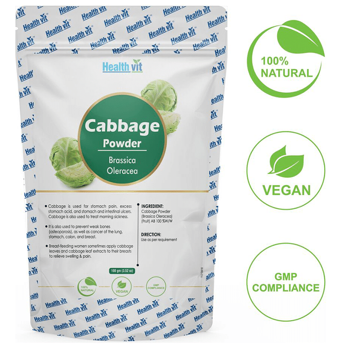 HealthVit Natural Cabbage (Brassica Oleracea) Powder Healthvit Cabbage powder contains cabbage (Brassica Oleracea) powder as its ingredient. Key benefits of Healthvit Cabbage powder: Used for stomach pain, excess stomach acid, stomach and intestinal ulcers, and a stomach condition called Roemheld syndrome. Also used to treat asthma and morning sickness. It is also used to prevent weak bones (osteoporosis), as well as cancer of the lung, stomach, colon, breast and other types of cancer. Direction for use: Mix 1 teaspoonful of this powder in 200ml of water or as directed by the physician. Safety information: Pregnant or lactating women are adviced to consume herbal products under the advice of the physician. No artificial color, flavor or preservative added, no chemical solvents. Use under medical supervision.