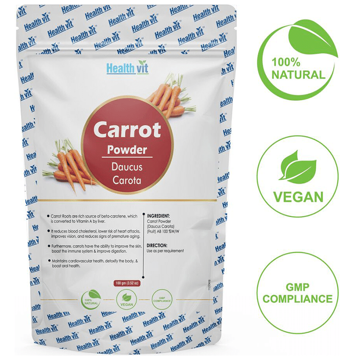HealthVit Natural Carrot (Daucus Carota) Powder Healthvit Carrot powder contains powder of carrot (Daucus carota) as its active ingredient. Key benefits of Healthvit Carrot powder: Rich source of beta-carotene, which is converted to vitamin A by the liver. Improve eyesight and skin health, and also have anti-cancer effects. It supports the liver and stimulates urine flow and the removal of waste by the kidneys. Direction for use: Mix 1 teaspoonful of this powder in 200ml of or as directed by the physician. Safety information: Pregnant or lactating women are advised to consume herbal products under the advice of the physician. No artificial colour, flavour or preservative added, no chemical solvents. Use under medical supervision.